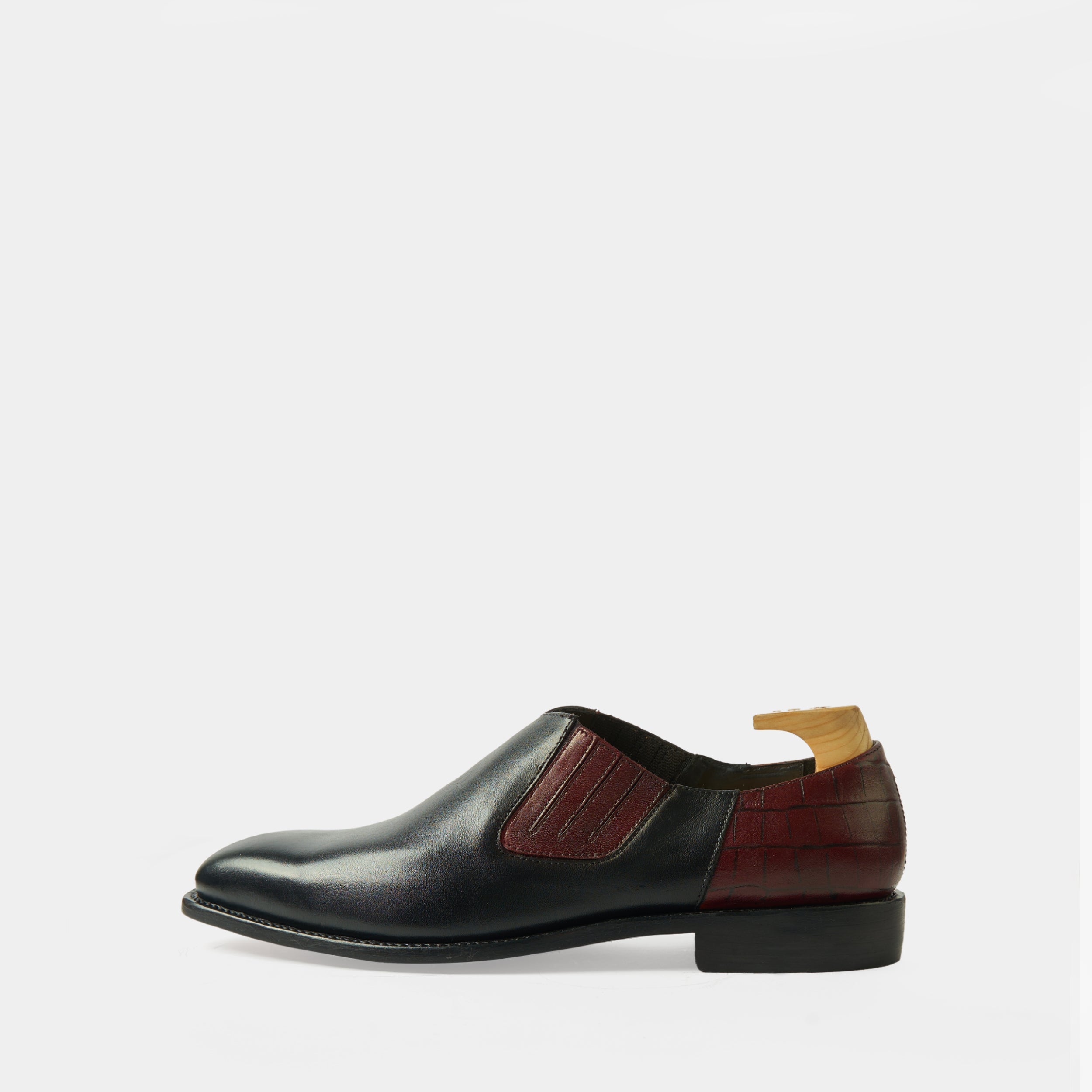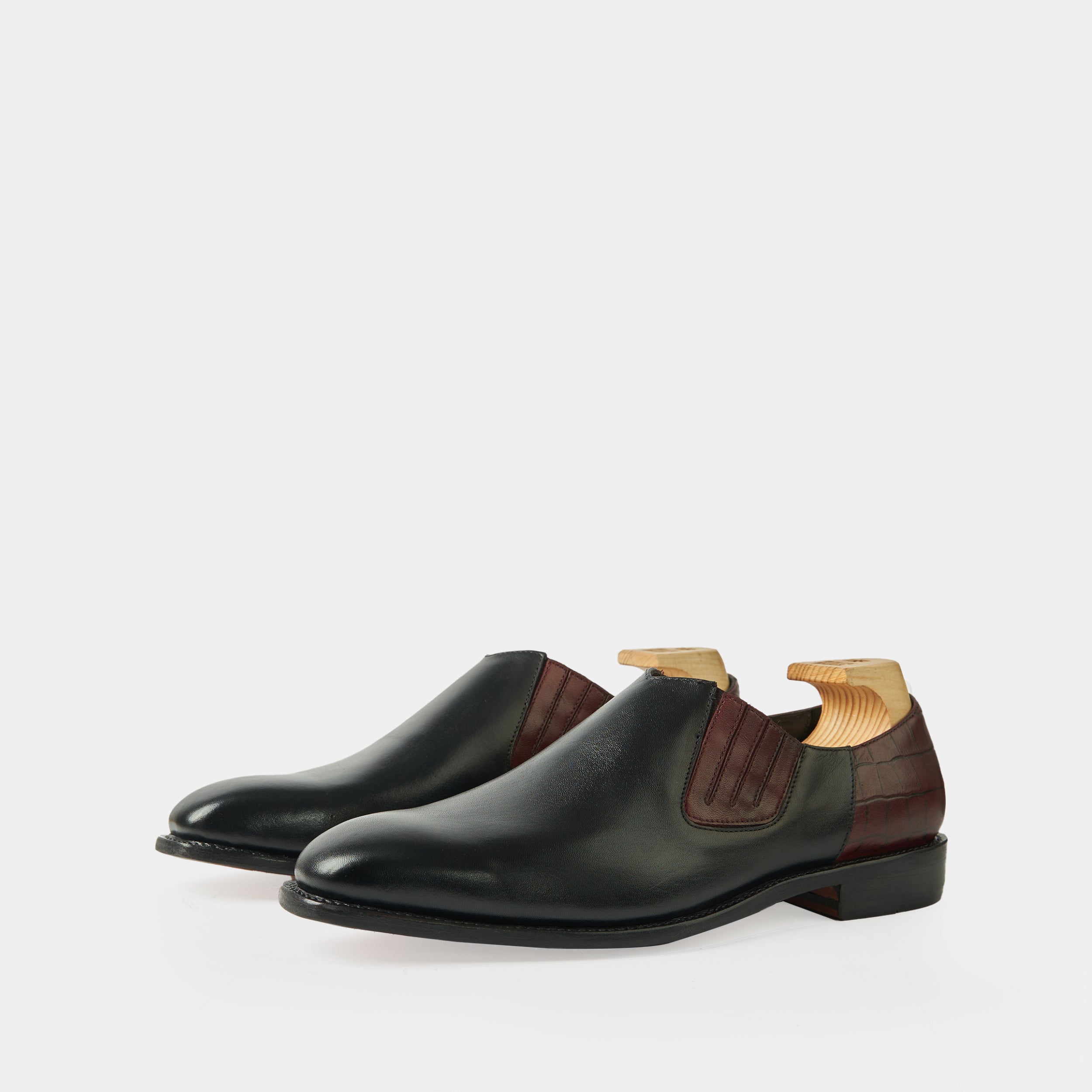 Albert black slip-ons with convenient side elastic panels for easy wear. The crocodile-embossed leather counter adds a touch of luxury and uniqueness. Designed for comfort and versatility, these shoes seamlessly elevate both casual and formal looks.